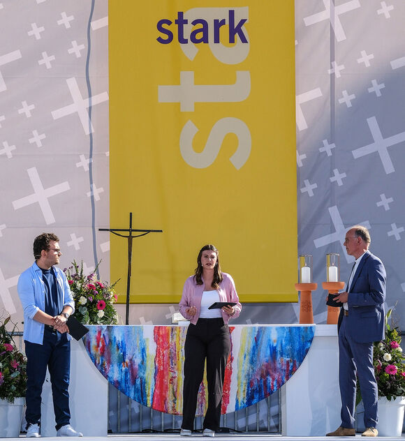 Brand: Wir haben in einem ersten Zoom-Meeting erstmal den organisatorischen Rahmen geklärt: Was kommt vor der Predigt, was kommt nach der Predigt, wieviel Zeit haben wir eigentlich? Und dann ging es los damit, was uns zum Thema Stärke einfällt, das stand im Mittelpunkt des Gottesdienstes. Jens hat das Thema „Stark gegen Rechts“ gebracht, das ist ja gerade so aktuell. Und dann kamen wir gleich ins Gespräch und haben gesagt, man will ja nicht immer nur stark gegen, sondern auch stark für etwas sein. Mir fiel dann sehr schnell meine persönliche Geschichte mit einer schweren Erkrankung in der engsten Familie während der Corona-Zeit ein – da mussten wir stark sein, obwohl wir schwach waren. Die Kernaussagen sind erst kurz vor dem Kirchentag entstanden. Wir haben uns in der Bischofskanzlei getroffen und das, was wir schon verschriftlicht hatten, vorgelesen. Da haben wir dann schon gemerkt, wenn etwas nicht passt. Später haben wir versucht, es frei zu üben – und schließlich sehr intensiv bei der achtstündigen Generalprobe einen Tag vor dem Kirchentag. Und dann gab es Stellproben, Sprechproben, Kameratraining. Und mit einer Stimmtrainerin haben wir es auch nochmal geübt.
